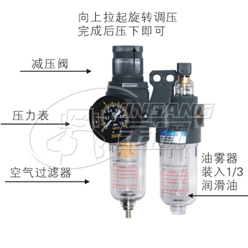 該氣源處理三聯(lián)件包括空氣減壓閥,過濾器、油霧器三大件。其中威壓閥可對(duì)氣源進(jìn)行穩(wěn)壓,使氣源處于恒定狀態(tài),可減小因氣源氣壓突變時(shí)對(duì)閥門或執(zhí)行器等到硬件的損傷。過濾器用于對(duì)氣源的清潔。可過濾壓縮空氣中的水分,避免水分隨氣體進(jìn)入裝置。油霧器可對(duì)機(jī)體運(yùn)動(dòng)部件進(jìn)行潤(rùn)滑。可以對(duì)不方便加潤(rùn)滑油的部件進(jìn)行潤(rùn)滑,大大延長(zhǎng)機(jī)體的使用壽命。o